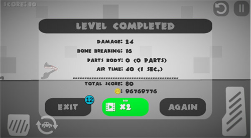 3、通过车辆撞击火柴人来获得奖励,伤害得越多奖励越高,不过要小心控制车辆,速度太快容易翻车哦。