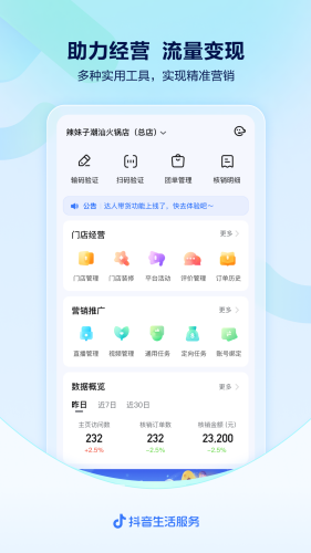 抖音来客app下载安装最新版本是抖音官方为本地实体商家打造的生活服务类工具,通过整合门店管理、营销推广、数据分析、交易结算等功能,帮助商家在抖音生态中实现“内容+交易”的闭环运营,商家通过它可快速完成门店认领、资质认证,发布团购套餐、优惠券等商品,提供了最佳的营销方案,各种优惠抖音团购套餐上架,并借助抖音的流量生态开展直播带货、达人探店合作等营销活动,为你轻松引流,查看自己的视频播放数据,让大家获得更好的客源及收益,平台还提供实时经营数据和智能流量匹配工具,帮助商家精准触达周边潜在客群,同时支持线上订单管理、售后处理等功能,有需要的用户可以下载使用。