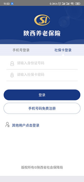 1、在本站下载安装陕西养老保险手机app,并且运行软件,然后会看到手机登入和社保卡登入: