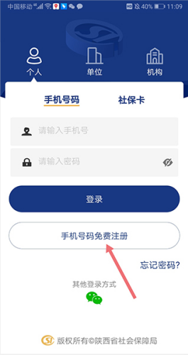 步骤一:打开“陕西养老保险”APP,进入登录页面下点击下方的“手机号免费注册”