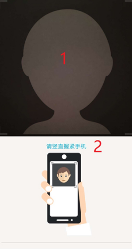 接着按照下图操作顺序,将脸部置于下图“1”位置正中央,然后按照下图“2”位置的文字提示完成实名注册操作