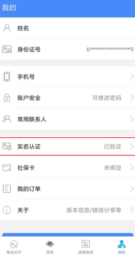 实名注册完成后用户就可以进入到应用的【我的】页面中查看到【实名认证】已验证通过了,如下图所示,这样就完成了实名认证流程了