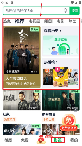 5. 前往“影视”分区获取更多电视剧、电影、综艺内容,支持限免剧集免费观看。