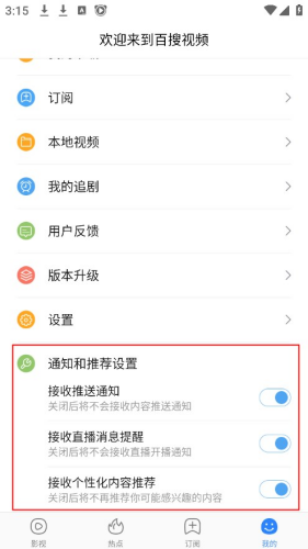 2、在我的界面滑到最底下,将通知和推荐设置里的内容全部关闭即可。