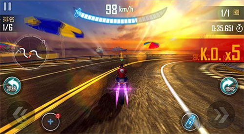 玩家人物头上的数字就是当前所在的名次,分别有左漂移和右漂移,左下角是干扰对手的火箭弹,右下角是加速瓶,在游戏中捡到的道具在本局游戏中也是可以使用的哦,是不是已经让大家摩拳擦掌了~