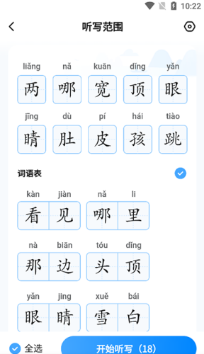 选择完成后,然后点击去听写,会看到该课文的所以字词,可以选择全选听写,也可以勾选一些不报。