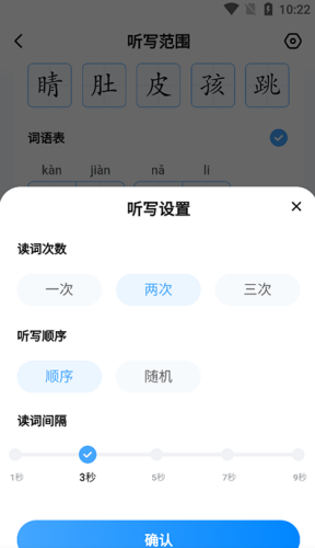 然后旁边可以进行听写设置,听写播报次数,顺序,播报间隔时间,设置完毕就可以开始自动听写,放给孩子自己听自己写。