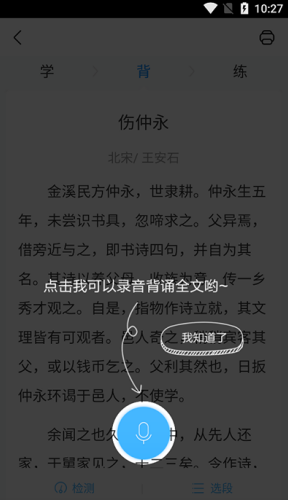 再说背诵,同样是选择教材和课文,选定后进入背诵,先会显示课文或背诵内容,点击开始背诵后内容消失并开始录音,边录音边识别边显示出已经识别的你背诵的内容。