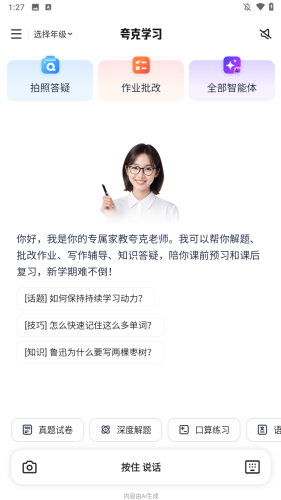 夸克学习app官方版是夸克旗下的AI辅助学习教育应用,以极简设计、高效工具、精准内容为核心理念,致力于为学生群体打造一个专注、纯净且功能强大的数字化学习空间,集六大核心功能于一体,深度解题服务可精准识别公式符号,提供数理化难题与作文思路讲解,百万级试卷库覆盖全国250+地级市,支持个性化组卷,里面的AI老师不仅具备自然生动的表情与语音交互能力,可以古诗文背诵,还可以教复杂的数学函数解析等众多理科知识,夸克学习app以“AI+教育”为核心,将传统学习流程转化为沉浸式互动体验,有需要的用户可以下载体验哦。