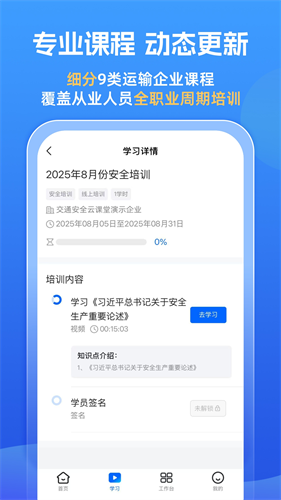 3、全场景课程覆盖:涵盖9大类运输企业(客运/货运/危化品等)专项课程,适配从业资格与继续教育需求。