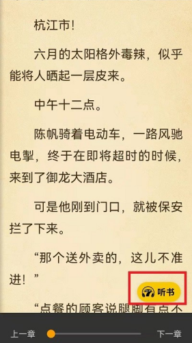 然后在小说阅读界面,点击中间位置,就会呼出功能选项,然后在右下角就有【听书】按钮,点击就可以听书。