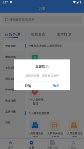 2、在底部的“办事”栏目中,有着更详细的关于社保各种服务办理,需要登录账号。
