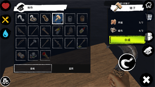 建造锤:用来扩展木筏,造成大船,具体作用后面会详细说明。合成:5木板,2废铁