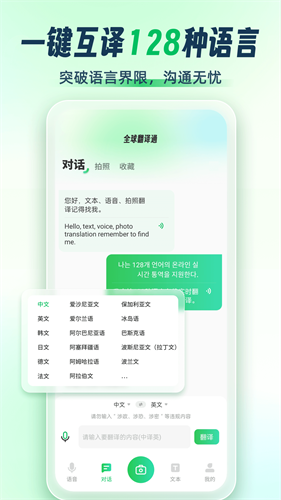 1、128种语言全覆盖:支持包括中文、英语、阿拉伯语等主流及地方特色语言双向互译,覆盖全球128个国家和地区语言需求。