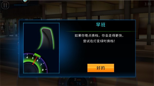 2、在竞速的过程中,当你看到绿灯时,点击换档可以加快赛车的速度;