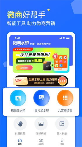 图片批量一键加水印,拼图海报、马赛克、贴纸、裁剪,加水印、去水印,简单易用。轻松实现微商高效图片视频处理,操作简单。通过对图片的后期处理,有效优化朋友圈,快速提高微商朋友圈交易成功率,做微商推广的好助手。