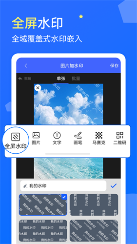 拍照加水印、图片加水印,批量添加水印。支持在线拍照美图加水印,在线微商星球模板,相册上传水印。支持添加文字水印、支持图片打码、加文字、剪裁、画笔、美颜、滤镜等常用P图功能,让你即便不会PS,没有美图秀秀也能获得想要的美图。