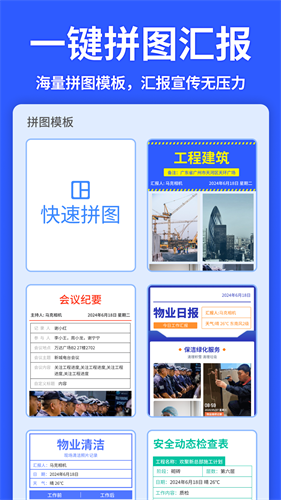 3、一键拼图,大量水印照片轻松汇总,汇报无忧。还可以一键生成视频工作汇报,更好的展示工作内容。