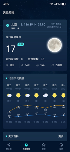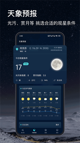 天文星空手机版是一款让普通人也能轻松读懂夜空的智能星图工具,它利用先进的3D建模与毫秒级天文算法,将真实星空精准投射到用户的手机屏幕上,无论身处城市阳台还是郊外旷野,只需打开应用,举起设备,就能实时看到头顶那片星空的本来面貌。这款应用并非简单展示星座连线,而是通过高精度3D引擎与实时定位技术,将整个天球动态呈现在用户眼前,不仅还原了肉眼可见的恒星、行星,还完整收录了中国传统星官与西方星座体系,每颗星星都附带详细数据、历史背景与精确坐标,轻轻一点即可查阅。天文星空手机版还特别还原了中国古代星官体系,让观星多了一层文化厚度,观星前,系统会自动分析当地天气、云量、月光干扰等条件,给出清晰的观星指数,帮用户避开阴天或满月的干扰。此外,内置的天文百科内容深入浅出,从行星运动到黑洞原理,从火箭发射到空间站轨道,知识密度高却不晦涩。感兴趣的小伙伴不妨下载试试吧。