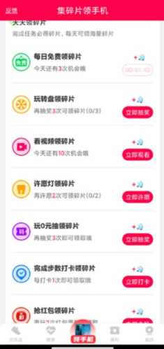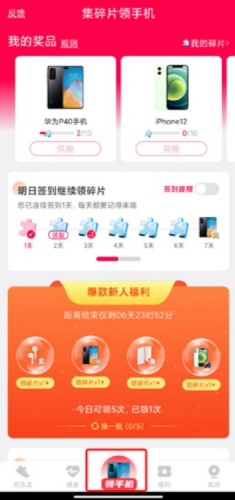 2、然后用户点击领手机页面:通过签到来领取碎片。