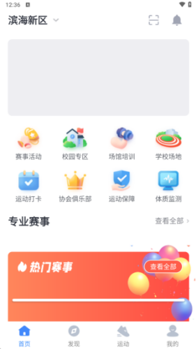 4、进入软件首页,涵盖了赛事活动、校园专区、场馆培训等功能区域。