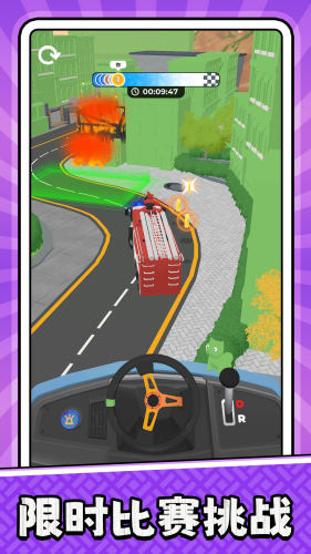 2、有着有趣玩法,限时赛道挑战中需操控车辆精准过弯规避障碍;消防救火模式里驾驶云梯车定位火源、完成扑救。