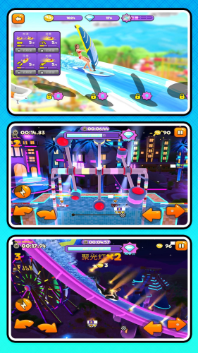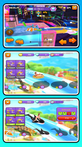 1、滑梯竞速过程极具爽感,角色在波浪滑梯上快速起伏滑行,配合加速道具触发的飞冲效果,让玩家体验极致速度带来的刺激。