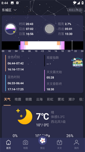 2、内置银河起落时间、星图、光污染指数及晨昏蒙影时段,助力星空摄影。