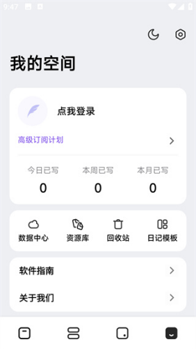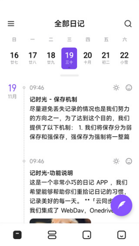 1、进入首页,有全部日记和日历,也可以点击右下角羽毛按钮快速记录。