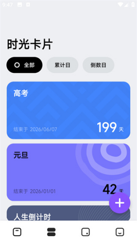 2、点击下方工具栏时光卡片,可以查看各类倒计时和累计日的信息。
