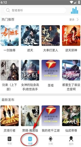打开听中国听书app后,点击底部中间的“书城”,就可以看到听书资源了;