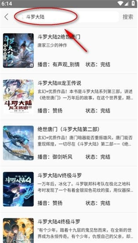 在最上面的搜索框可以直接搜索要听的小说名,或者作者名也可以,比如斗罗大陆;