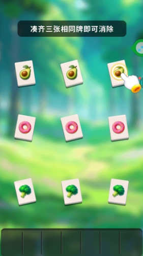 1、登陆进入游戏,按照图中的指示,点击三张相同的美食卡片进行消除,全部消除完就可以完成任务。