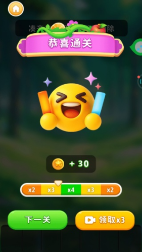 2、完成每个关卡的消除任务均可以获得金币奖励,观看视频还能3倍进行领取,然后进入下一关。