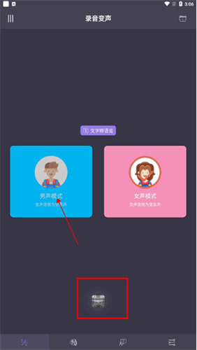 1、想要正常使用“专业变声器”,大家就得先在首页选择变声的模式,这里以“男生模式”为例子,点击下方的麦克风进行录音