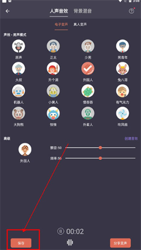3、只要选中想要设置的变声音效,用户就能够点击底端按钮保存变声后到音频文件,非常方便快捷;