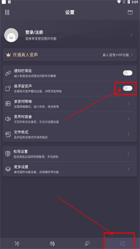 4、如果想要开启“语音聊天变声模式”的话,大家可以点击右下角按钮进入设置页面,开启“悬浮窗变声”功能就行了。
