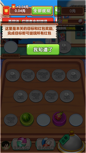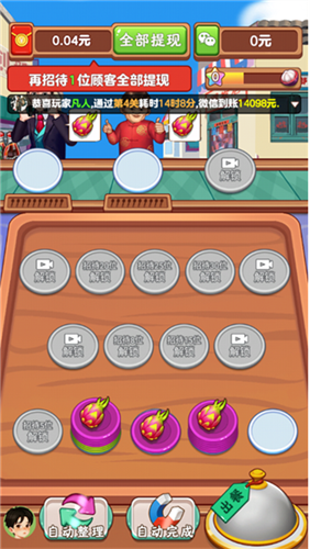 3、我们将菜品交给外卖员这样就完成游戏流程了,此外,我们完成相应的关卡之后还能够解锁红包,达到相应的目标就可以提现。