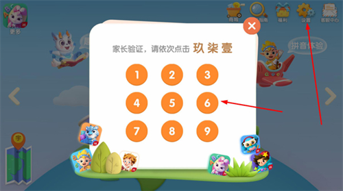 1、洪恩识字app主页面,点击右上角设置,进行验证;