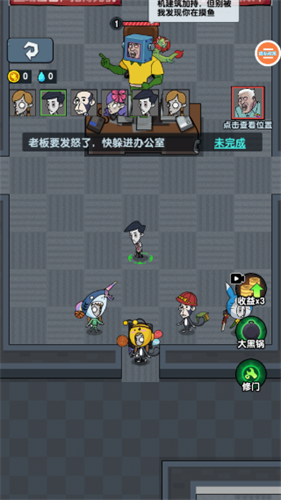 3、游戏中,根据提示(如“老板要发怒,快躲办公室”)操作角色躲避,利用【修门】等功能,注意收益(如【收益x3】),完成任务推进关卡,体验职场摸鱼与躲避的刺激句号。