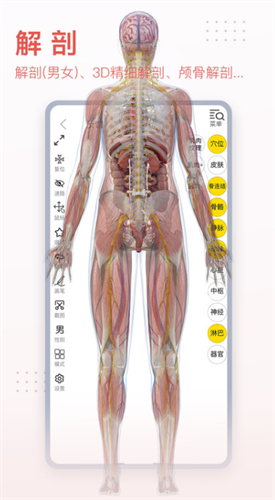 3Dbody提供了男女二套全三维的数字模型,5000多个人体结构,完整全面的解剖学数据,涵盖了人体所有解剖系统,同时提供了英文发音、文字注释、穴位等信息。操作功能强大,通过实时三维操作,轻易获得层层解剖人体的学习机会,本App适用医学和健康相关专业从业者,为最受欢迎的医学图像App。随意放大缩小,高清观察细节,部位还能透明化观察等功能。让你更好的了解学习人体解剖。