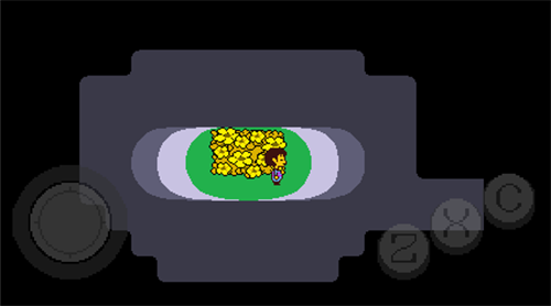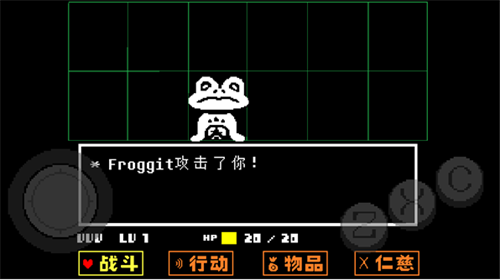 4、去到北面的藤蔓房间内会遇到青蛙froggit,选择“行动——赞美”,虽然青蛙不知道你在说什么,但他变得很开心,他就会逃离战斗。在右面的水池上有一个尖刺陷阱,Toriel会牵着你的手通过这个陷阱区域。