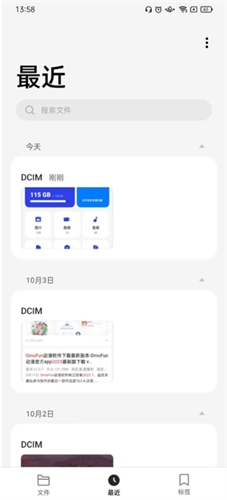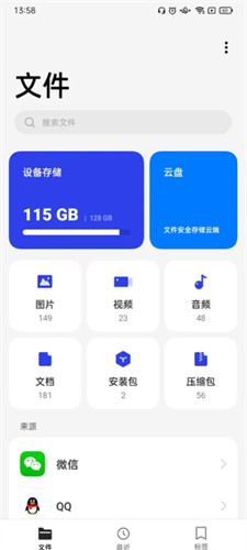 根据分类快速浏览不同格式的文件,包括下载的文件、最近创建的文件、大文件等。