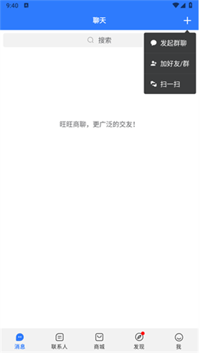 1、打开旺旺商聊app,直接进入消息一栏,点击加号,可以发起群聊、加好友还能扫一扫。