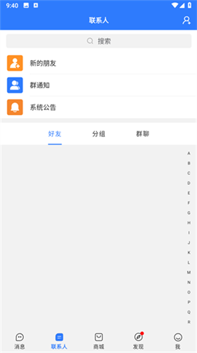 2、点击联系人,你可以加好友,进行好友的分组与管理,创建群聊。