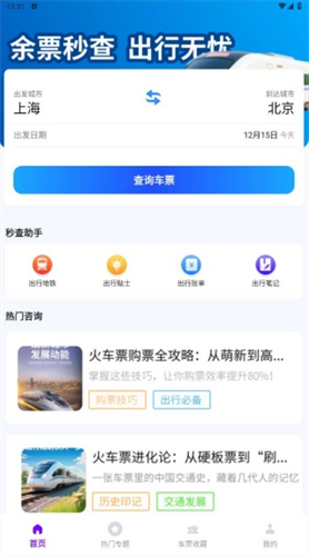 1、首页轻松就可以去进行余票查询,让大家出行无忧,一键点击查询。