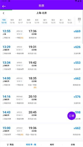 2、实时展示列车发车时间、余票情况,助力用户精准把握购票时机,避免延误。
