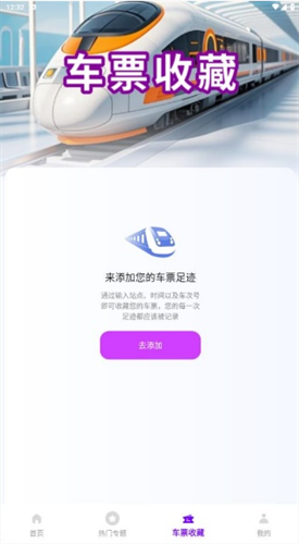 4、车票收藏,轻松就可以添加你的车票足迹,直接点击去添加记录。