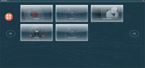 1、首先在本站下载并打开TRS12火车模拟器,进入主页后你可以看到5个不同的选项,分别是教程、路线、存档、模型广场以及额外内容,同时在屏幕左侧还可以看到“虫虫助手”按钮。