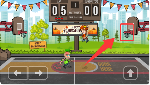 2、我们按住屏幕左下角的两个箭头可以控制角色移动,用手指按住屏幕右侧空白区域可以控制角色跳投,不过跳投的时候的注意一点,在主角跳到空中的时候就得放开手指,否者我们的角色是不会将篮球投出去的。